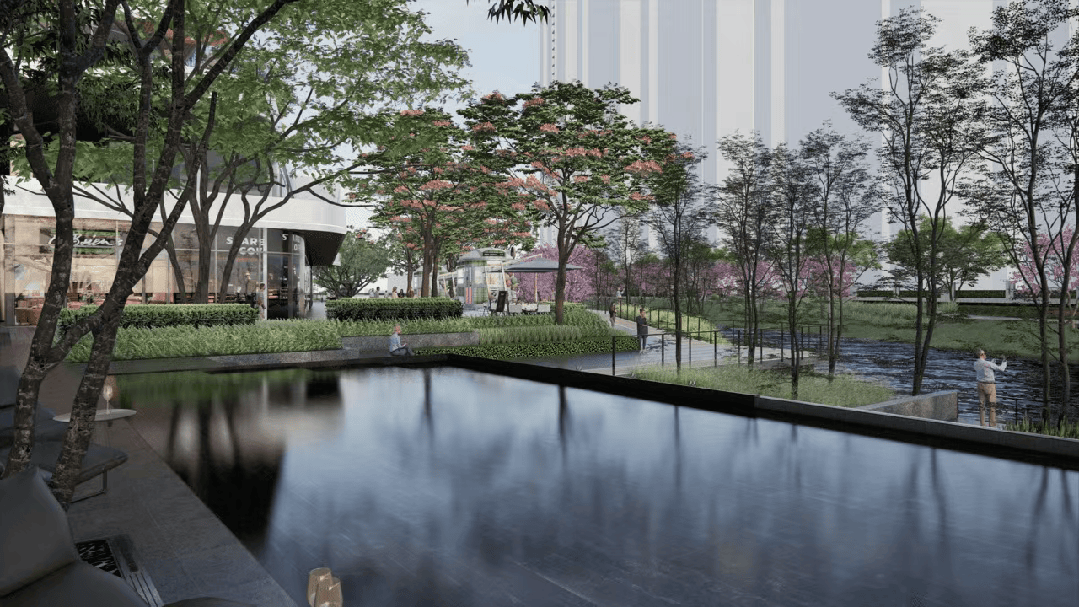 与此同时,项目紧邻面积高达1100公顷的海珠国家湿地公园,这是广州中轴上的超级绿肺,南面隔新滘西路就是海珠湿地上涌生态科学院。根据广州市政府发布的《国家历史文化名城广州历史文化名城保护规划(2021-2035年)》,广州将重点保护“一环两轴、多脉多点”的古城特征,其中就包括延续城市轴线与生态绿洲的融合发展。中海大境巧妙结合河道及两岸条件,提升河岸景观,贯通滨水步行体系,形成浮岛式的空间形态,从空中俯瞰与绿洲充分连接,达到一体化融合的效果,如今河道两岸布置的喂食设施已经开始吸引白鹭等候鸟栖息,“白水塘边白鹭飞”的诗意栖居在城市中成为现实。