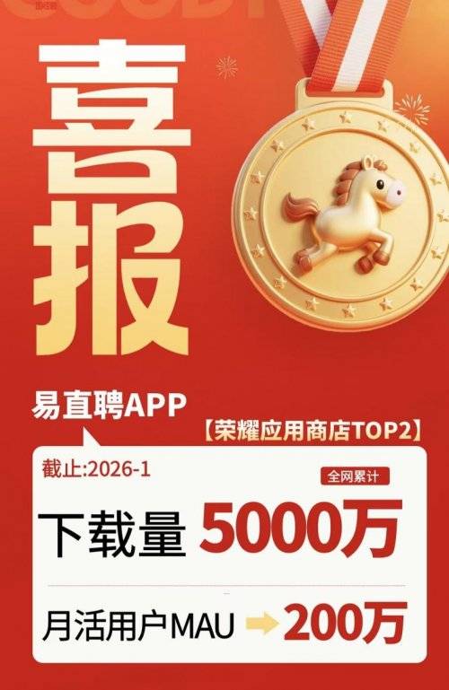 2026-01-16南宫28官网,南宫28官方网站,南宫28APP下载在“海投简历石沉大海”“企业空岗难觅人才”的行业困境下,创新招聘平台易直聘交出了一份亮眼答卷。截至2026年1月,平台全网累计下载量正式突破5000万大关,月活跃用户(MAU)飙升至200万+,单日活跃用户峰值高达10万人次,较2025年12月实现翻倍增长,成为招聘赛道名副其实的“增长之王”。在渠道竞争力方面,易直聘表现尤为突出,不仅在苹果App Store、华为应用市场、小米应用商店等主流平台招聘类排行榜稳居前列,更凭借高用户满意度登顶荣耀手机应用商店招聘类TOP2品牌,用数据印证了市场对其“真实、高效、精准”服务理念的高度认可。